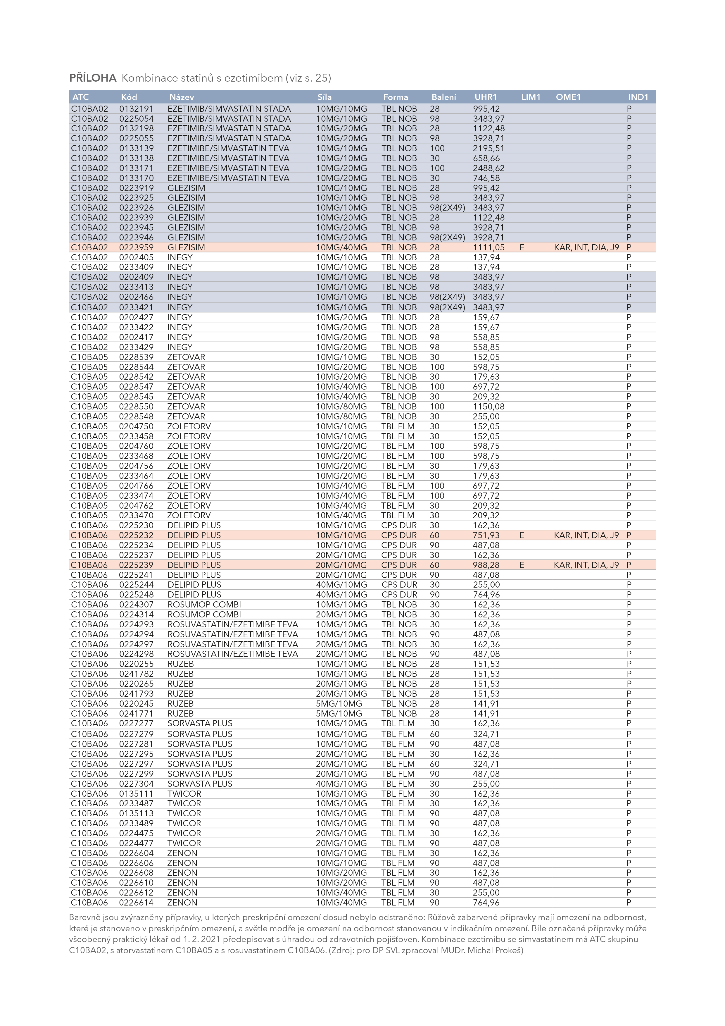 Naštěstí výše popsaná situace už od 1. 2. 2021 neplatí. Dočkali jsme se uvolnění i kombinované tablety statin+ezetimib! Pro informaci o léčebných možnostech uvádíme přehled kombinovaných přípravků na našem trhu ve formě tabulky viz níže. Tabulka je převzata z doporučeného postupu Novelizace léčby dyslipidemií 2021 SVL ČLS JEP. Bohužel, přes veškeré úsilí dosud stejně nebyly uvolněny všechny kombinace! Bíle označené přípravky může všeobecný praktický lékař od 1. 2. 2021 předepisovat s úhradou od zdravotních pojišťoven. Barevně jsou zvýrazněny přípravky, u kterých preskripční omezení dosud nebylo odstraněno. Růžově zabarvené přípravky mají omezení na odbornost, které je stanoveno v preskripčním omezení, a světle modře je omezení na odbornost stanovenou v indikačním omezení. Takto označené přípravky zatím praktičtí lékaři nesmějí na pojišťovnu předepisovat.