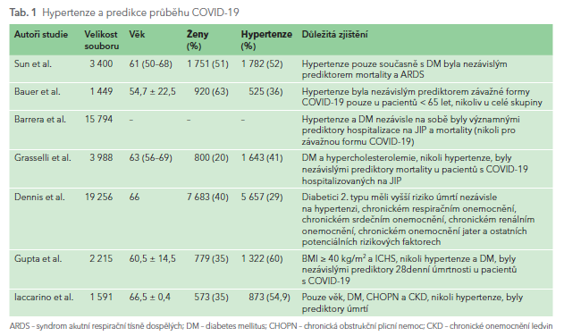 První zprávy z ohnisek COVID‑19 (Wu‑chan, Lombardie a New York City) informovaly o vyšší prevalenci hypertenze u hospitalizovaných pacientů se závažným průběhem COVID‑19. Velká americká studie zahrnující 5 700 hospitalizovaných pacientů nalezla celkovou prevalenci hypertenze 56 %, což bylo velmi podobné údajům z Číny (50 %) a Itálie (49 %). Navzdory těmto pozorováním vztah mezi hypertenzí a COVID‑19 není jasný. Závažnější průběhy onemocnění COVID‑19 jsou popisovány u starších osob, které také mají vyšší prevalenci hypertenze. Průměrný věk pacientů hospitalizovaných v Lombardii a New Yorku byl 63 let a prevalence hypertenze u těchto nemocných odpovídá prevalenci hypertenze v obecné populaci. Byla nalezena vyšší prevalence hypertenze u hospitalizovaných a kriticky nemocných pacientů s COVID‑19. Není však jasné, zda tento vztah je kauzální, anebo zda je ovlivněn jinými faktory, jako je věk a ostatní komorbidity asociované s hypertenzí (obezita, diabetes mellitus, chronické renální onemocnění), protože většina studií nezahrnula diabetes a obezitu do multivariační analýzy. Velká čínská studie zahrnující 3 400 osob prokázala, že hypertenze sama o sobě nebyla nezávislým prediktorem průběhu onemocnění, nýbrž pouze v kombinaci s diabetem nebo ostatními rizikovými faktory (Sun et al., 2020). Někteří autoři neprokázali vliv hypertenze ani diabetu na průběh onemocnění COVID‑19 (Gupta et al., 2020), zatímco podle jiných jak hypertenze, tak diabetes s obezitou nebo bez obezity byly nezávisle spojeny s horším průběhem.