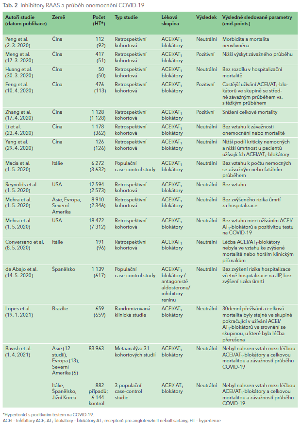 Nejdůležitější studie analyzující průběh onemocnění COVID‑19 a užívání blokátorů systému renin‑angiotenzin‑aldosteron jsou uvedeny v tabulce (tab. 2). Zatím byla publikována pouze jedna randomizovaná klinická studie, která zahrnula 659 pacientů léčených inhibitory ACE nebo AT1-blokátory a hospitalizovaných pro mírný nebo středně závažný průběh COVID‑19.8 Pacienti byli náhodným způsobem rozděleni na skupinu, u které byla léčba inhibitory ACE nebo AT1-blokátory přerušena (n = 334), a na skupinu, u které léčba pokračovala (n = 325). Hlavním hodnoceným parametrem bylo přežívání 30 dní od randomizace. Mezi oběma skupinami nebyly nalezeny významné rozdíly v tomto parametru (21,9 ± 8 dní u skupiny, která léčbu přerušila, versus 22,9 ± 8 dní ve skupině, která v léčbě pokračovala) ani v celkové úmrtnosti (2,7 % vs. 2,8 %).